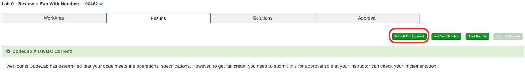 - One or more of the lab exercises in a Lab may be marked for 'Approval', which means that even once it passes CodeLab's tests, it will remain