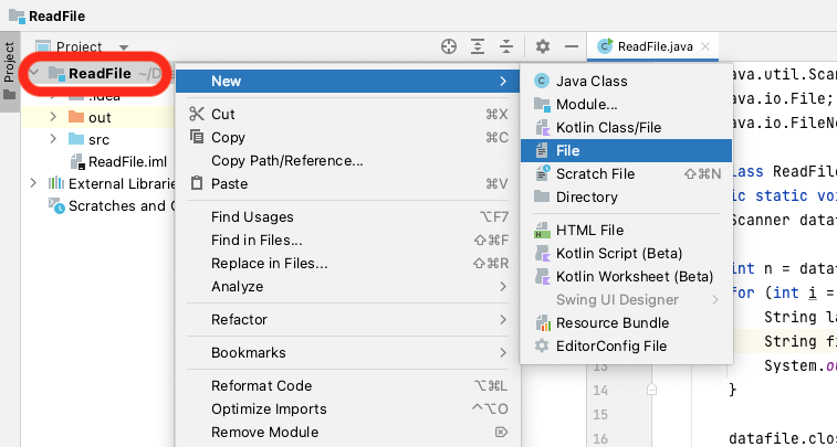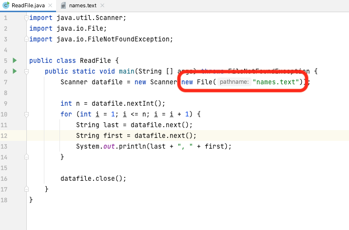 import java.io.*; import java.util.*; … public static void main(String [] args) throws Exception { Scanner scanner = new Scanner(new File("data.text")); // preparing to read data from the file data.text …