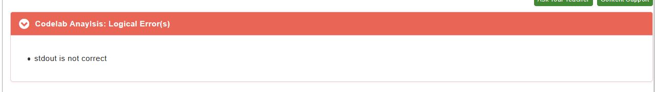 - If your submission fails CodeLabs tests, you will be presented with your output as well as the expected output
