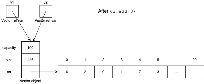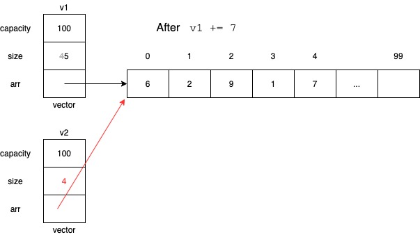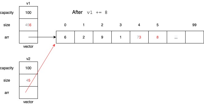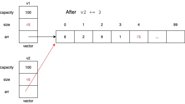 Notice how, while the size data member of the v1 object has been updated, the size of v2