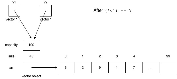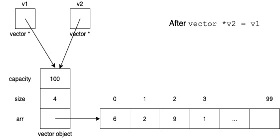 In the copying scenario above, we used a customized copy constructor to ensure full value semantics; here we are going to use pointers